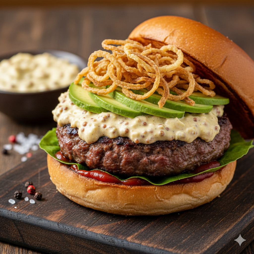 Grille die Patties auf dem heißen Rost. Dann der Aufbau: Ketchup, Salatblatt, Senf-Eier-Soße, Patty, Avocadoscheiben, Röstzwiebel. Fertig ist ein Burger, der jeden Schnellimbiss in den Schatten stellt.