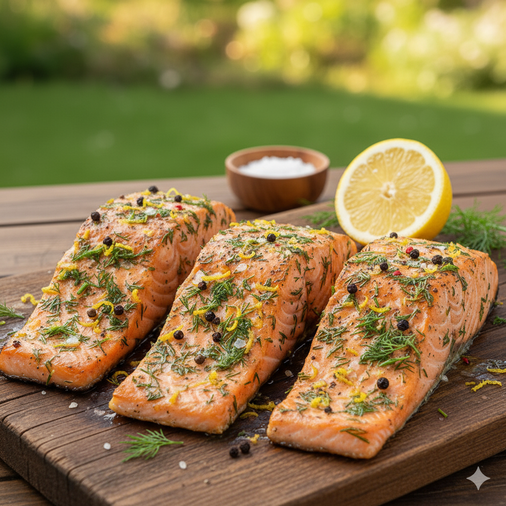 Die perfekte Marinade: Frischer Dill mit Olivenöl, Bio-Zitronenschale und -saft. Mit Meersalz und schwarzem Pfeffer abschmecken. Eine Stunde im Kühlschrank ruhen lassen – dann kann es losgehen!