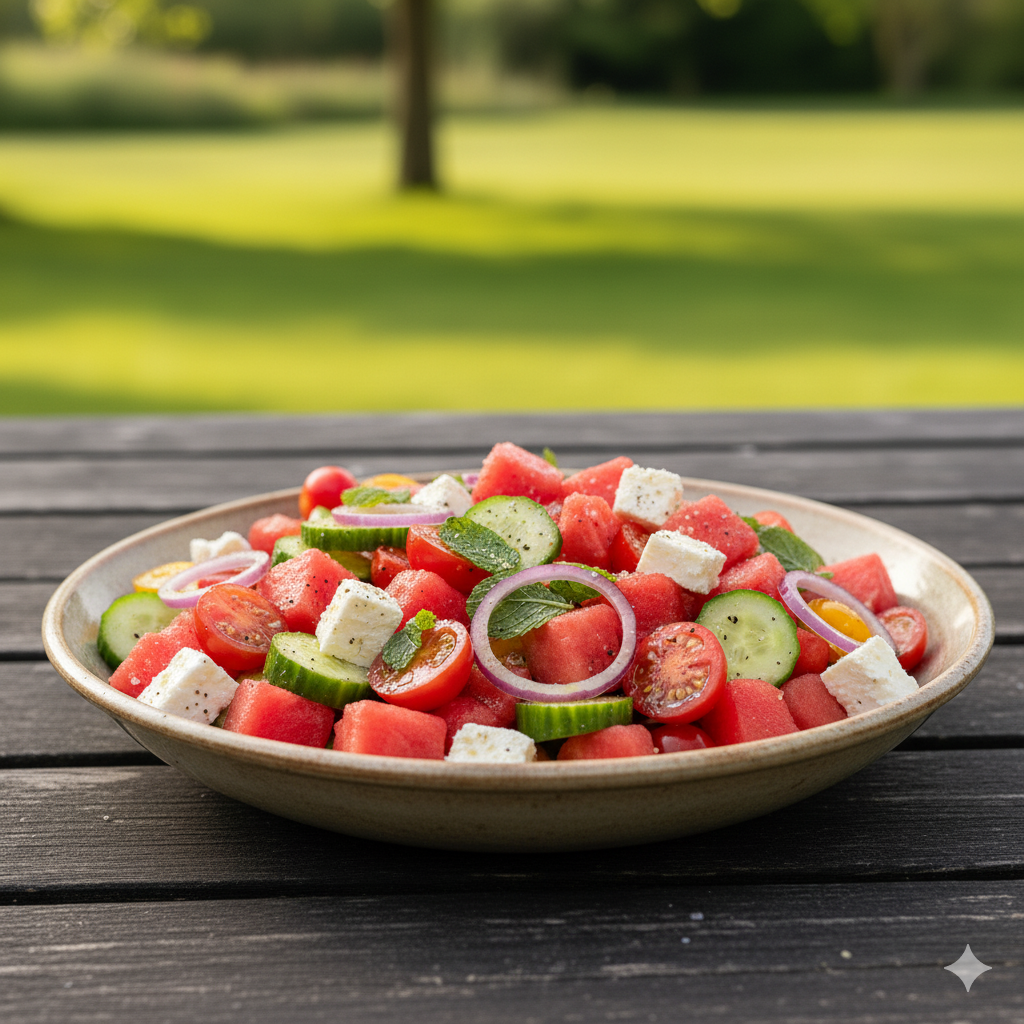 250 g süße Wassermelone in Stücke. Dazu Tomaten, Gurke, rote Zwiebeln. 100 g würziger Feta-Käse in Würfel.