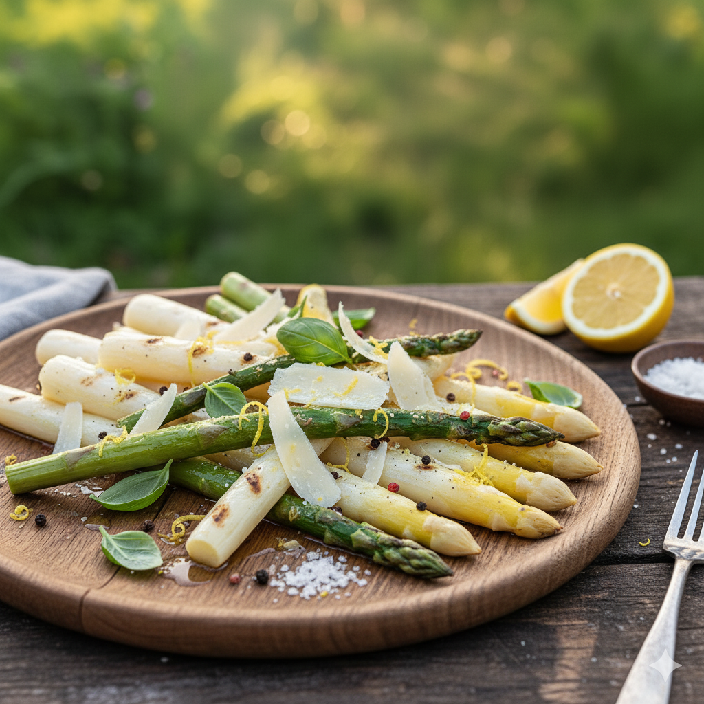Meine Profi-Technik: Weißer Spargel braucht 5-6 Minuten Vorgarkochzeit, grüner nur 2-3 Minuten. Dann kommt das Olivenöl darüber und ab auf die heiße Glut! Regelmäßig wenden – nach 5-7 Minuten ist er perfekt.