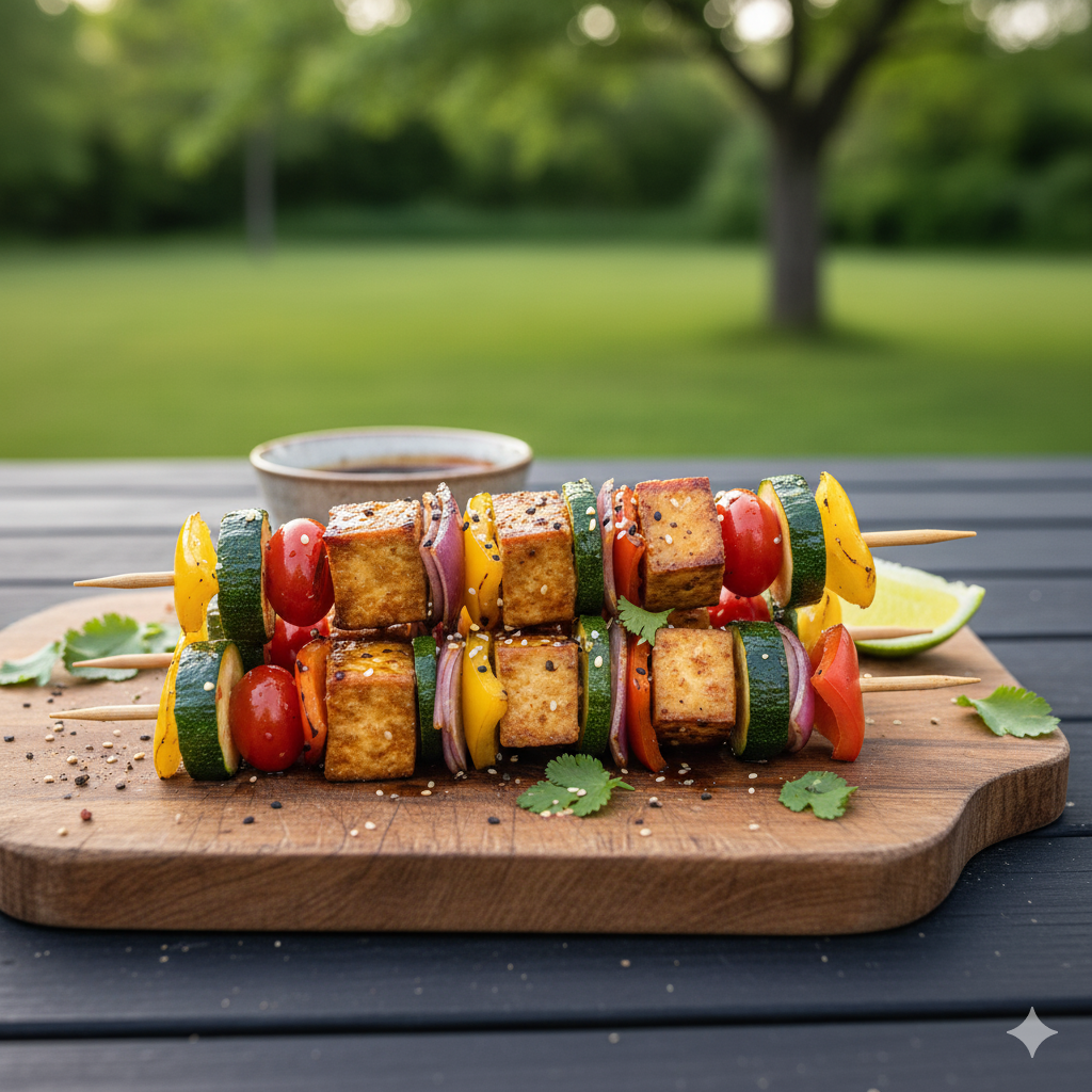 Bei mittlerer Hitze grillen – 4-5 Minuten pro Seite, bis das Gemüse gebräunt ist und der Tofu knusprig wird. Zwischendurch mit Marinade bestreichen.